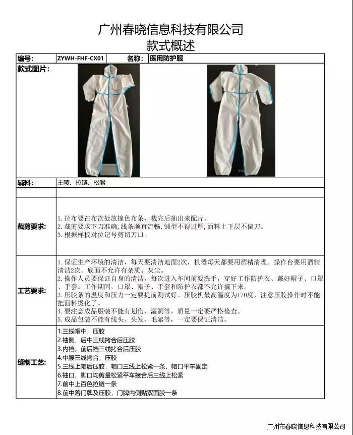 相关生产技术文档如下,希望可以帮助到所有防护服生产商,以最快速的时间,最准确的做工标准投产。